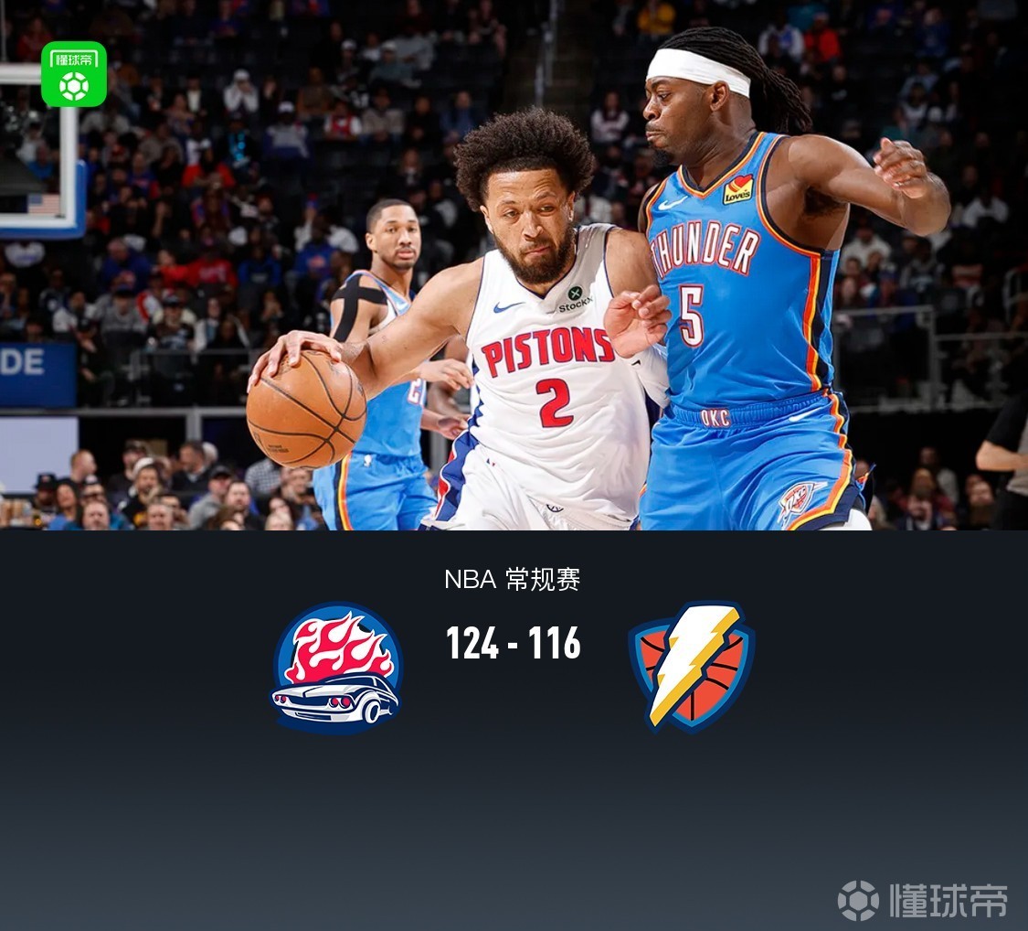 活塞124-116残阵雷霆,坎宁安29+13+8失误,杜伦29+15,杰林威30+11