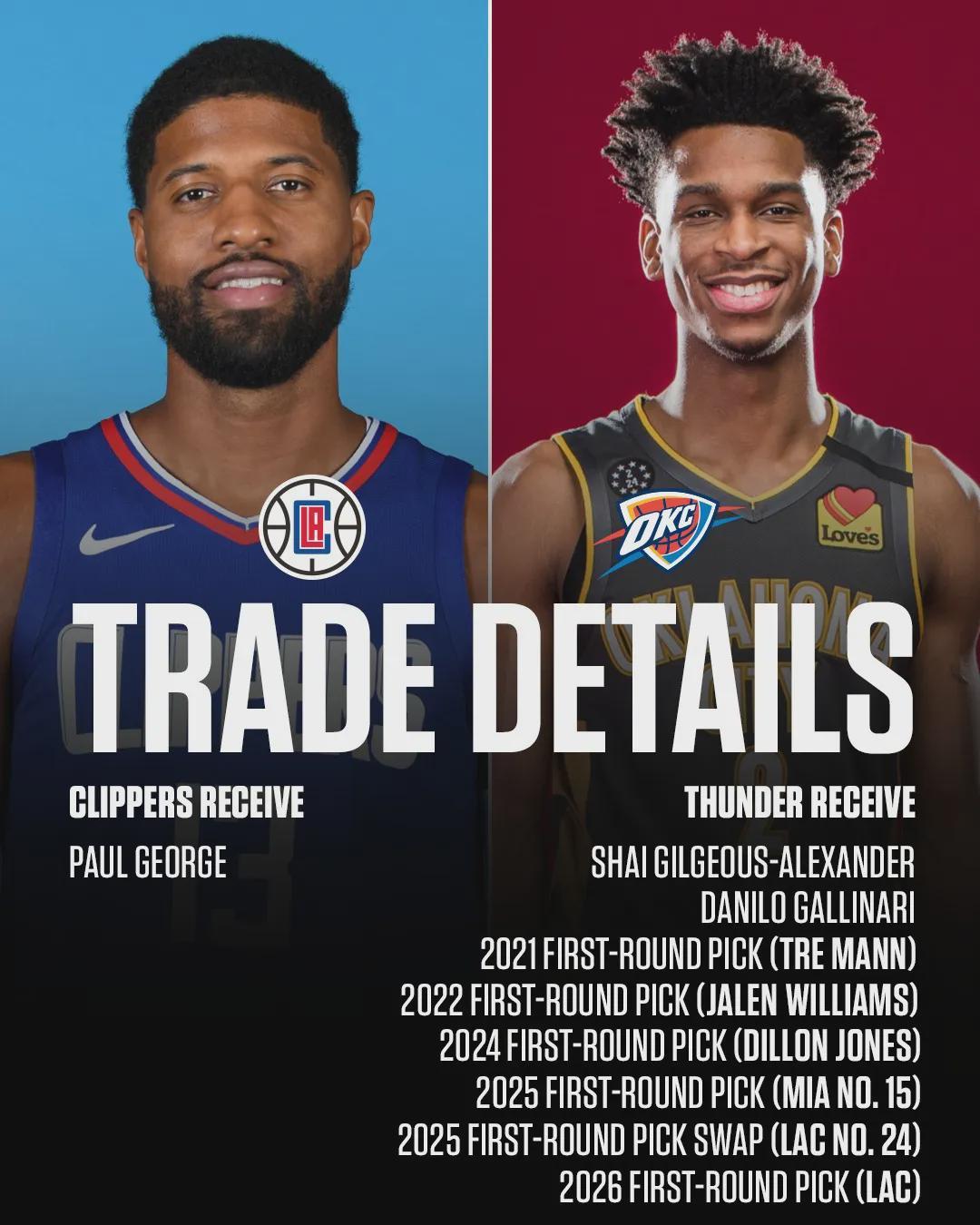 2019年夏天,为了得到保罗-乔治,快船送走5个首轮签和2个首轮互换权。快船2026年的首轮签在雷霆手里,2028年首轮签在76人手里。2027年和2029年的首轮互换权也被送走。快船有意在2027年开始重建,对他们来说选秀权至关重要。