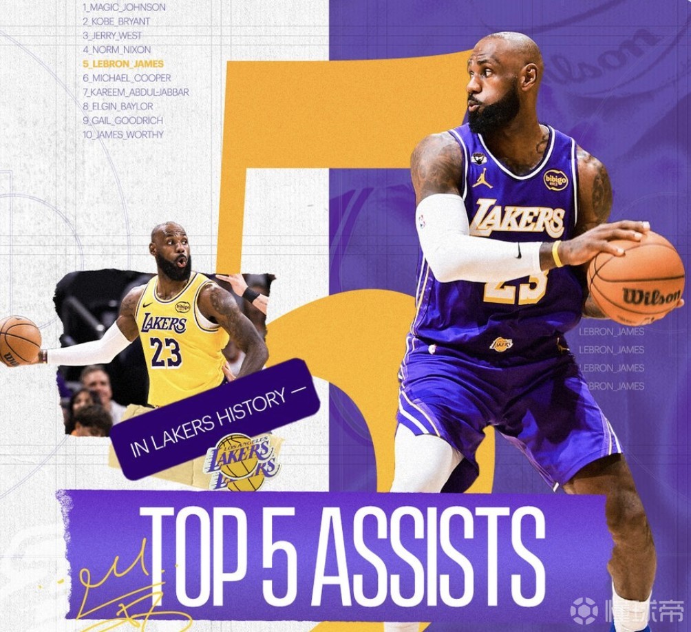 詹姆斯湖人生涯总助攻数达3669次,升至队史助攻榜第五位