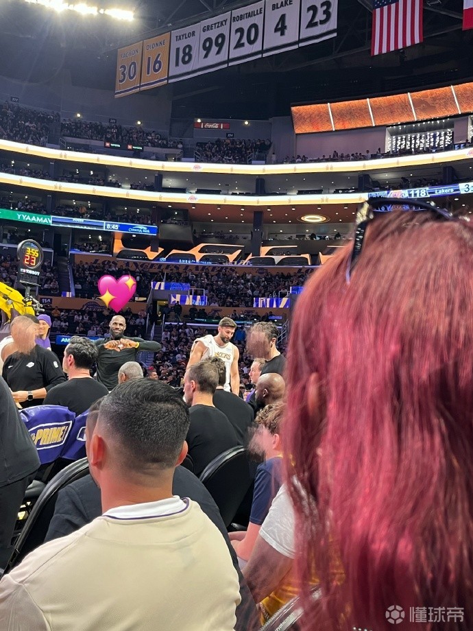 而詹姆斯或许也是发现了她在观众席的靓丽身影,向她比了个心。