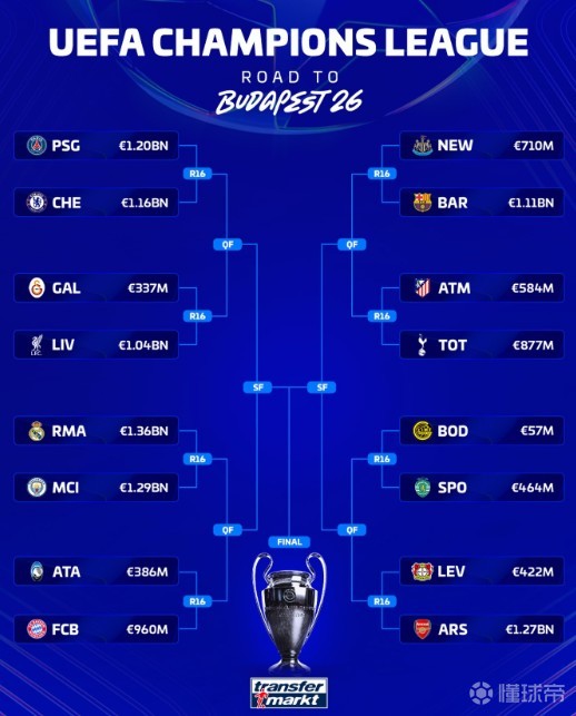德转列欧冠16强对阵身价:阿森纳与勒沃库森相差8.5亿欧