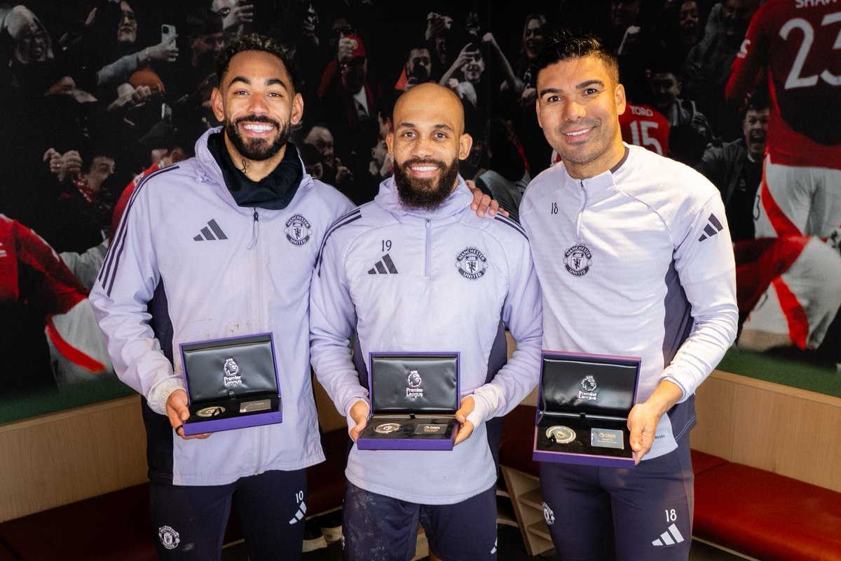 在分别达成英超特定进球、出场数里程碑后,曼联球员卡塞米罗、姆伯莫和马特乌斯-库尼亚获赠纪念奖章。