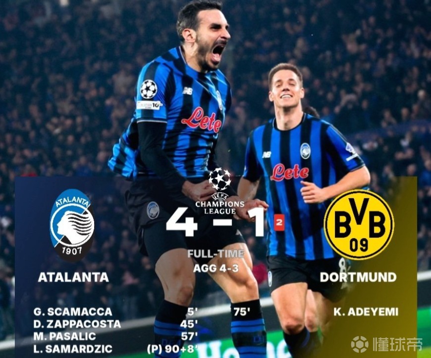 北京时间2月26日,在欧冠淘汰赛附加赛次回合的比赛中,亚特兰大在首回合0-2告负的情况下,最终依靠斯卡马卡、扎帕科斯塔以及帕萨利奇的进球,外加萨马尔季奇读秒的点球绝杀4-1大胜多特蒙德,两回合总比分4-3逆转晋级。