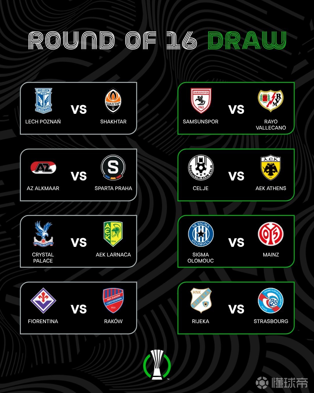 北京时间2月27日晚21点,2025-26赛季欧协联1/8决赛抽签结果出炉。 ![]() ![]() 欧协联1/8决赛对阵上半区顿涅茨克矿工(乌克兰)vs波兹南莱赫(波兰) 布拉格斯巴达(捷克)vs阿尔克马尔(荷兰) AEK拉纳卡(塞浦路斯)vs水晶宫 琴斯托霍瓦(波兰)vs佛罗伦萨 下半区巴列卡诺vs萨姆松体育(土耳其) 雅典AEK(希腊)vs采列(斯洛文尼亚) 美因茨vs奥洛莫茨(捷克) 斯特拉斯堡vs里耶卡(克罗地亚) (*种子队在左侧) 欧协联淘汰赛时间(北京时间)1/8决赛首回合:3月13日凌晨 1/8决赛次回合:3月20日凌晨 1/4决赛首回合:4月10日凌晨 1/4决赛次回合:4月17日凌晨 半决赛首回合:5月1日凌晨 半决赛次回合:5月8日凌晨 决赛:5月28日凌晨(举办地德国莱比锡红牛竞技场) |