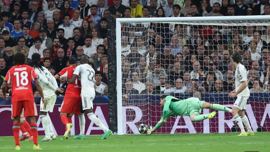 库尔图瓦在欧冠淘汰赛附加赛次回合对阵本菲卡的比赛中完成4次扑救。其中一次扑救尤为突出:第36分钟,比分1-1平,葡萄牙球队打出长传反击,里奥斯在禁区弧顶位置大力低射,库尔图瓦迅速下地单手将球挡出,显得极为灵活轻巧。根据《阿斯报》的报道,库尔图瓦的这个快速下地技巧师从洛利雄,此人也是切赫的指导教练。