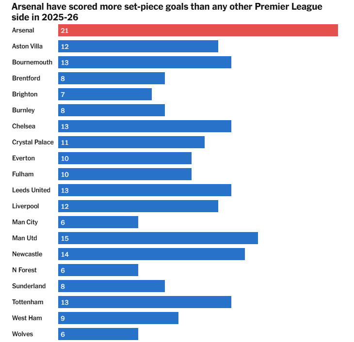 这也是阿森纳本赛季在英超联赛中第九次通过角球打入制胜球。这已经是单赛季球队通过角球打入制胜球的最高纪录(超过了曼联在2012-13赛季创造的8次纪录)。 阿尔特塔在周日的赛后新闻发布会上谈到定位球进球时说:“我们已经好几周没打进定位球了,但我们在运动战中进了不少球。今天我们有机会利用这种机会得分;我们做得很好,但我们也丢球了。”那么,继续加油并改进吧。 本文链接 消息来源:https://www.nytimes.com/athletic/7080468/2026/03/02/arsenal-set-piece-goals-nicolas-jover-contract/ |